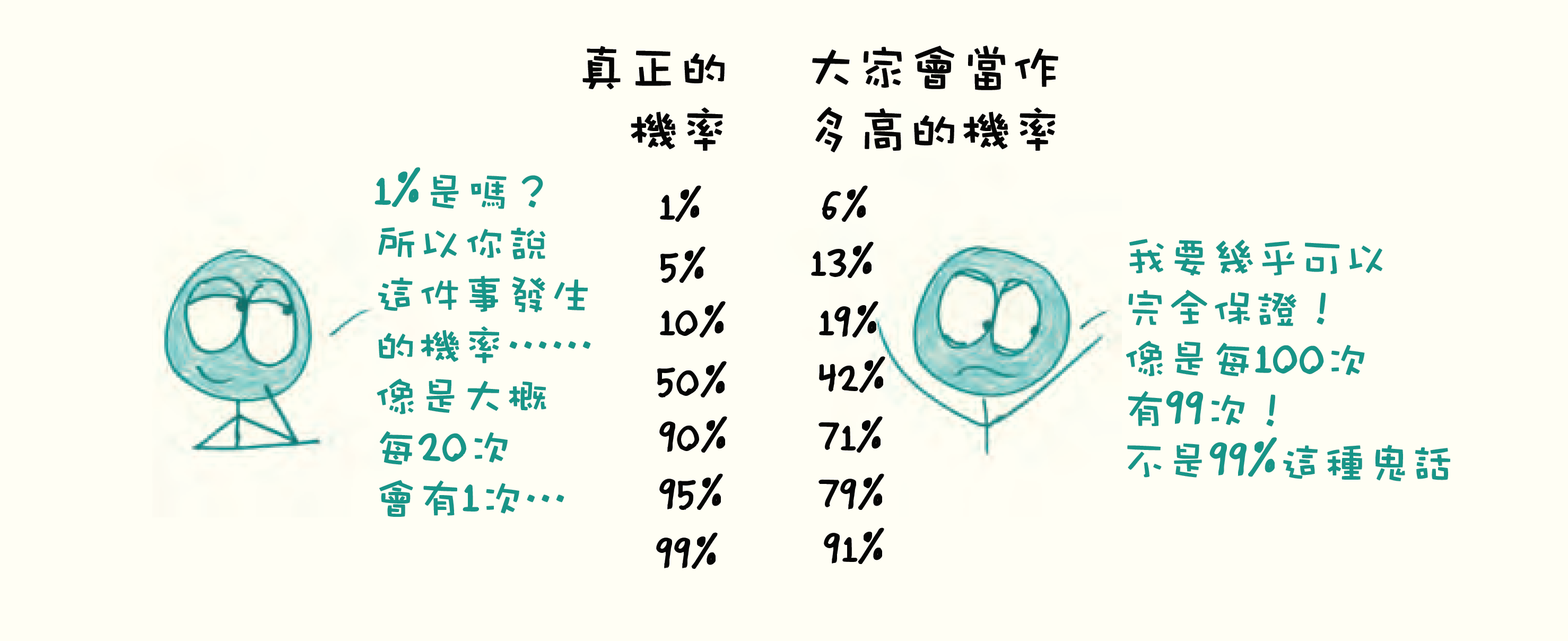 如果真要說句公道話,應該說人類處理機率的能力實在爛透了。康納曼和特沃斯基在心理學研究中發現,人類對於不確定的事件有頑固的錯誤想法。他們會一而再、再而三地高估可能性微乎其微的事件,並低估幾乎鐵定會發生的事件。
