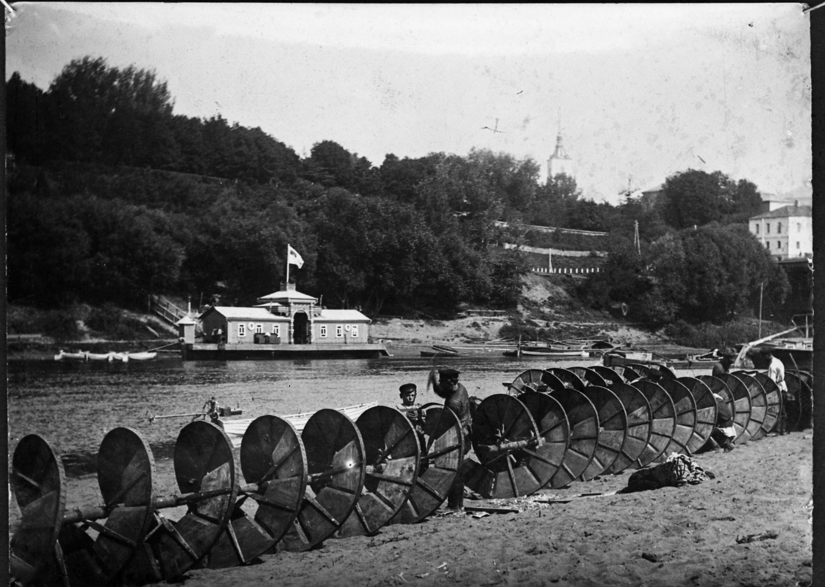 這些長達三.五公尺、直徑約三十公分的管子,以塗有瀝青的布料包裹,並以繩索鞏固;在其內部,螺旋形的分隔則以壓成薄片的木板製成,膠著後以銅釘固定。四根像這樣的水螺絲聯合起來,能將水位垂直提升約六公尺的高度。