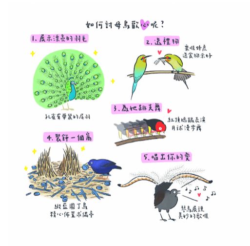 挑剔的母鳥透過公鳥各式各樣的展示行為,去判斷候選人的健康狀況、覓食能力等等,綜合各種蛛絲馬跡再從中挑出最滿意的公鳥配對,就有機會獲得較好的基因!