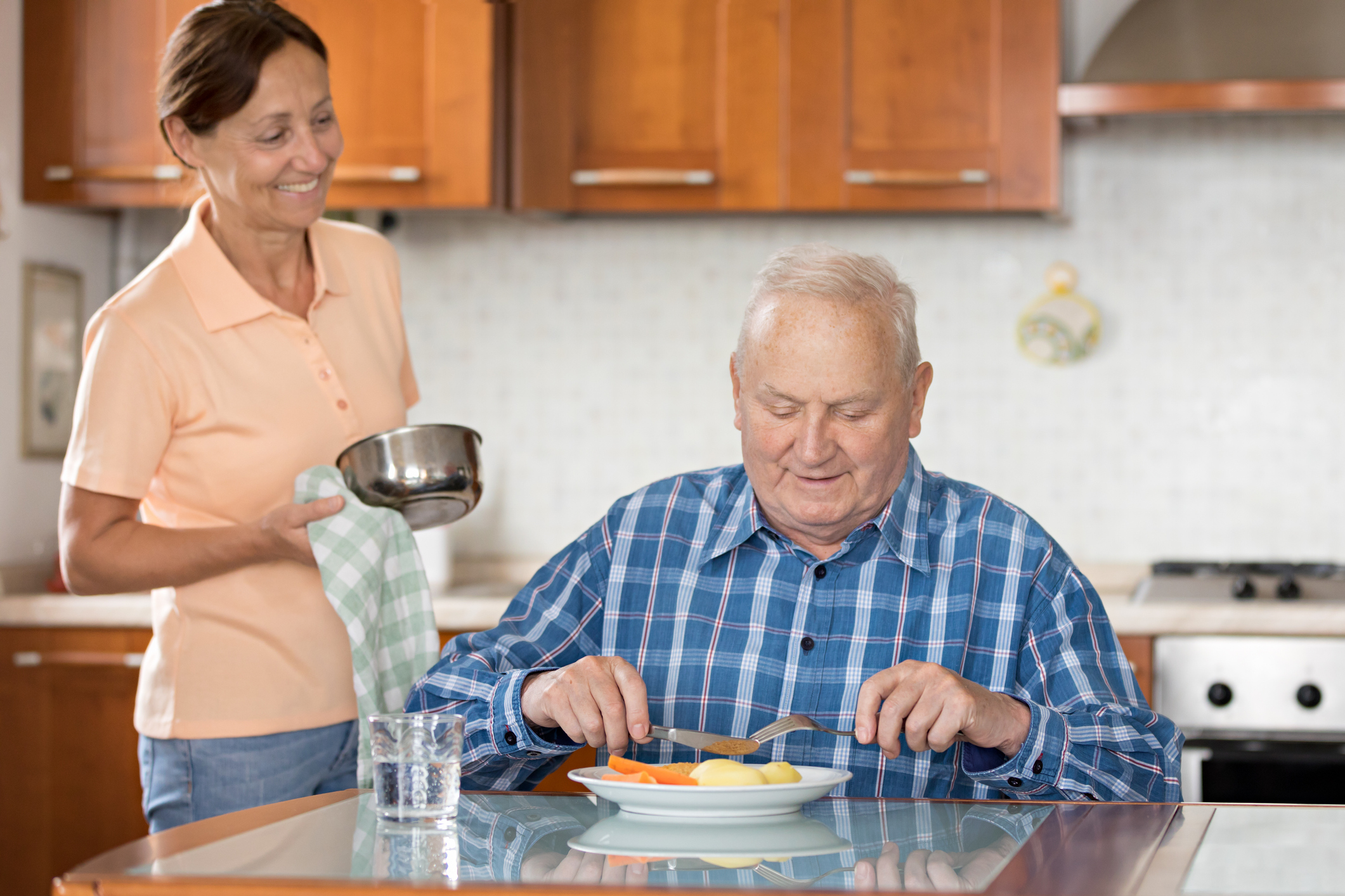 Home Caregiver giving senior man lunch