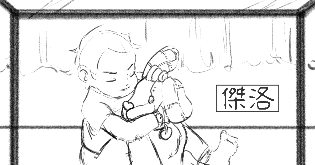 大樹底下,樹根盤結,只見一堆濕漉漉的樹葉。鳩特蹲著,把枯葉一把撥開,果然見到一隻機器狗。那隻機器狗舊得不像樣。狗毛沾染泥水,稀疏破爛,而無毛的表皮更是刮痕累累,隱約可見其底下的機械線路。傑洛泡在泥水坑裡,周圍伴有幾件破損的舊物,鐵罐、網球、飛盤、斷了手臂的塑膠玩偶,都是男孩的舊玩具。