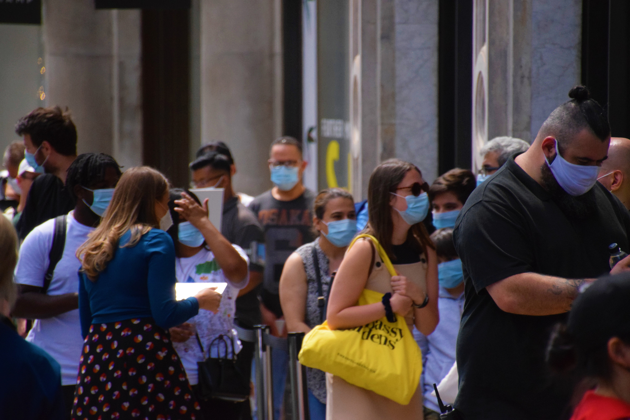 London, United Kingdom - July 12 2020: customers wearing face masks queuing outside a shop in Central London