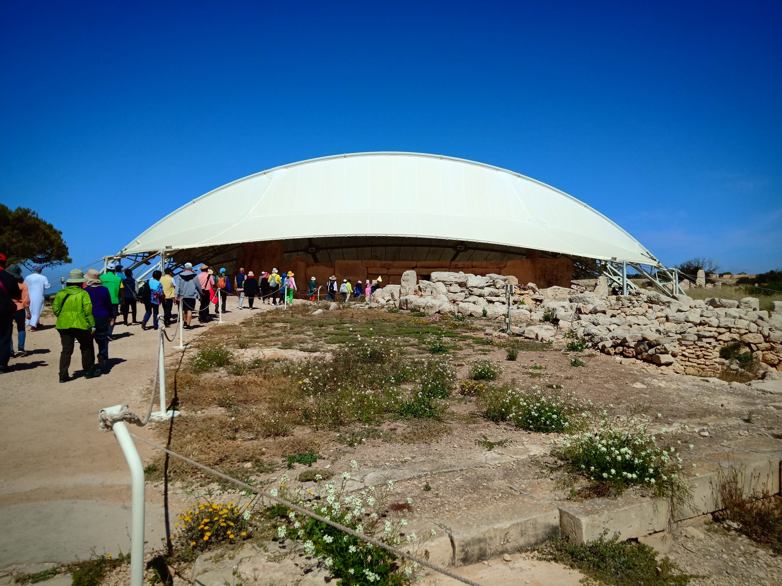 我們在神殿停留一個小時。哈扎伊姆神殿由主殿和一旁的三所附屬巨石建築構成。主殿建於西元前三六○○年至三二○○年,較英國巨石陣早,也較最古老的金字塔早,是世間現存最古老的巨石文化遺址。神殿的巨石最重的超過二十公噸,高逾六公尺。有組織的社會,才能以巨石建造神殿,可見當時已有相當健全的社會組織。我在很年輕時就知道馬爾他的史前巨石文明遺跡,沒想到親眼看到了、親手摸到了。
