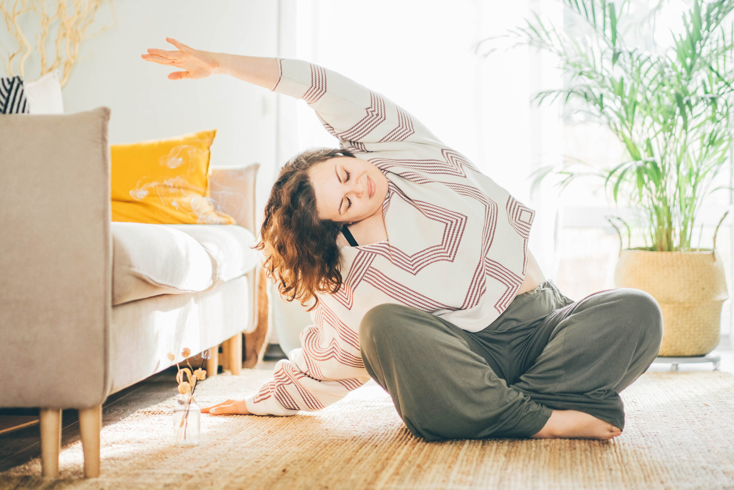 Plus size woman doing yoga and meditation at home.