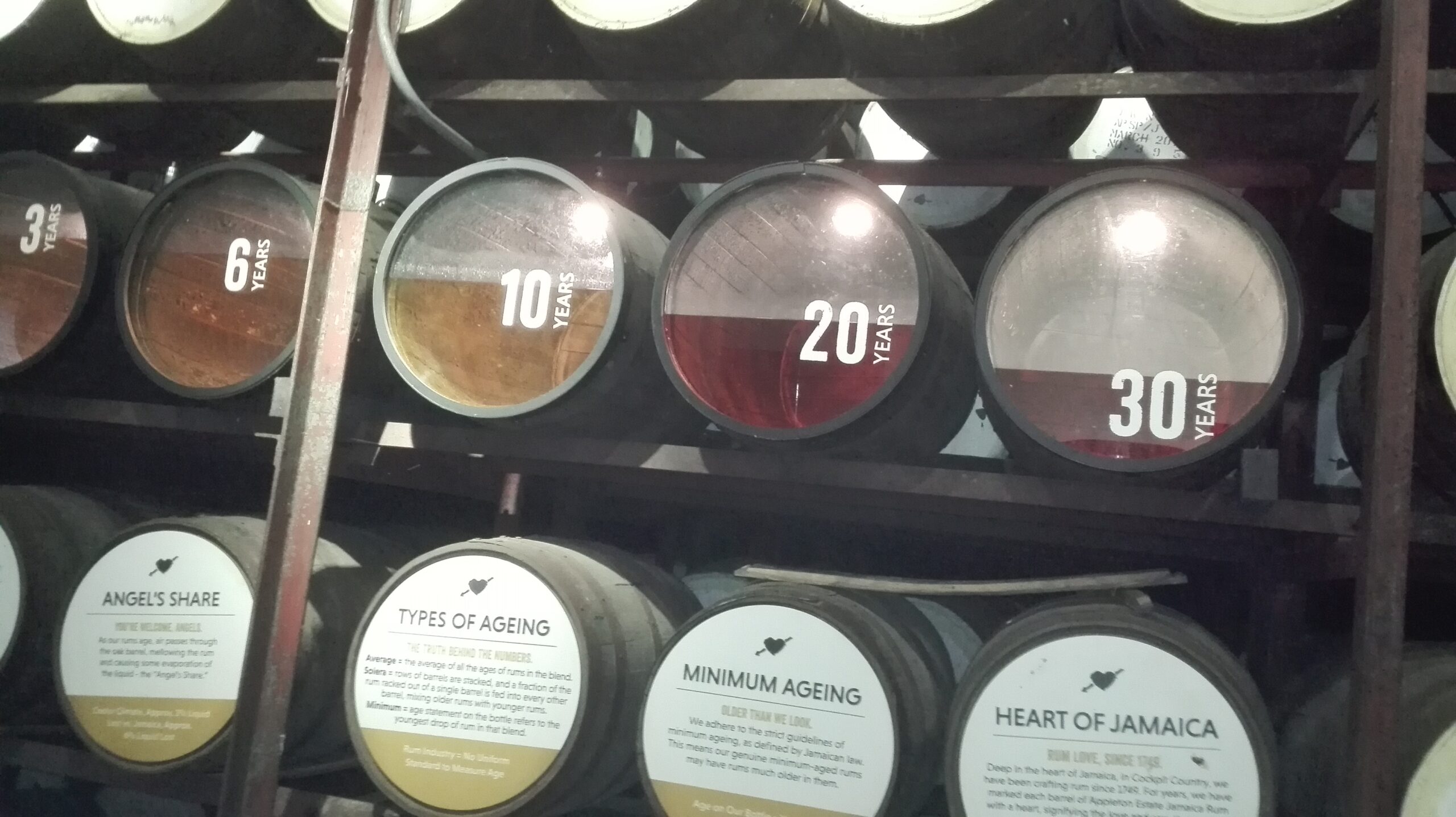 走出蒸餾廠房,解說員帶我們去看熟成室,也就是酒窖。打開深鎖的厚重木門,裡面是一排排不鏽鋼架,上頭橫擺著橡木桶,打印著年份等資料,自三年至五十年不等。靠近門口處的一排橡木桶,其中有五個桶的桶底鑲著玻璃,分別標註著三年、六年、十二年、二十年、三十年,可以看出酒的色澤和揮發程度。蘭姆酒熟成過程中仍會揮發,儲存三十年的那一桶,已揮發得大約只剩下三分之一,色澤當然較深。