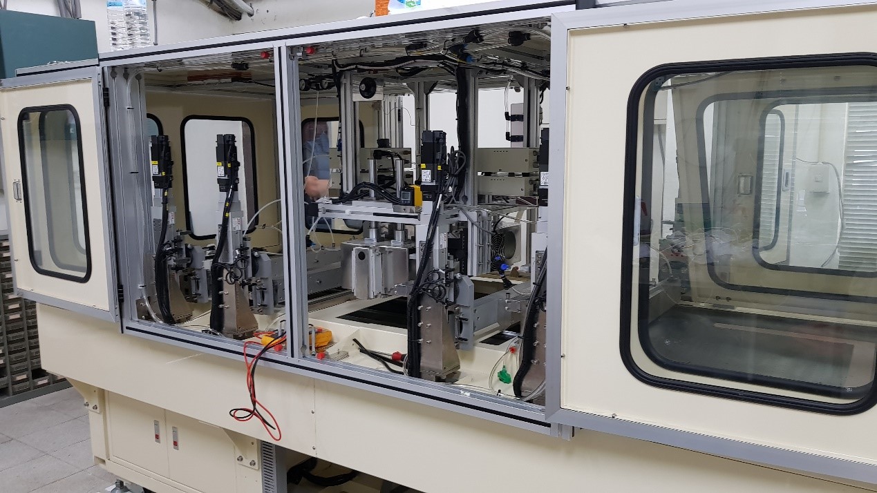 談起這幾年鈣鈦礦的興起,林唯芳認為這是非常有希望的一種材料!在這幾年的積極努力下,林唯芳不但在鈣鈦礦太陽能電池的研究上有進展,還為技術的產業化努力,鼓勵畢業同學廖學中與許哲溥,創立前創科技公司,專精於鈣鈦礦太陽能電池材料的製造和生產,並和臺大機械系的黃秉鈞教授、億尚精密機械公司合作,共同研發了專門塗佈製作鈣鈦礦太陽能電池的機器(如圖 4)。另外也和生產矽晶太陽能電池的聯合再生公司合作,發展大面積高效率層疊太陽能電池,形成了上中下游完全自主整合的一條鞭生產鏈。