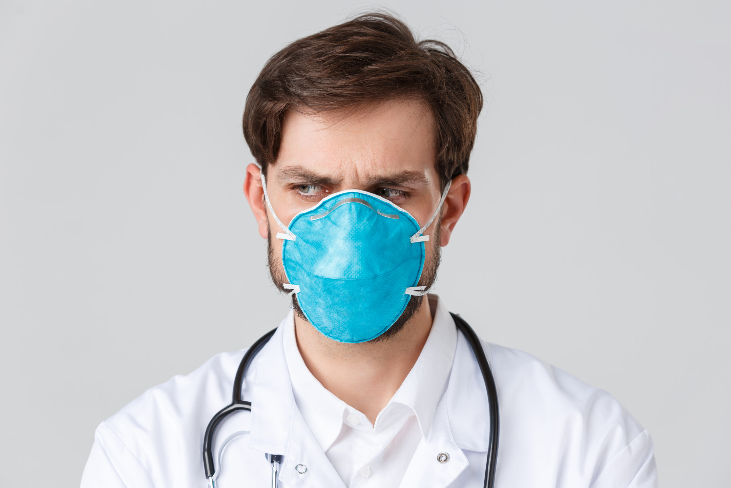 Hospital, healthcare workers, covid-19 treatment concept. Close-up of troubled and concerned doctor in medical respirator and scrubs, looking away with frowning face, feel nervous or upset, thinking.