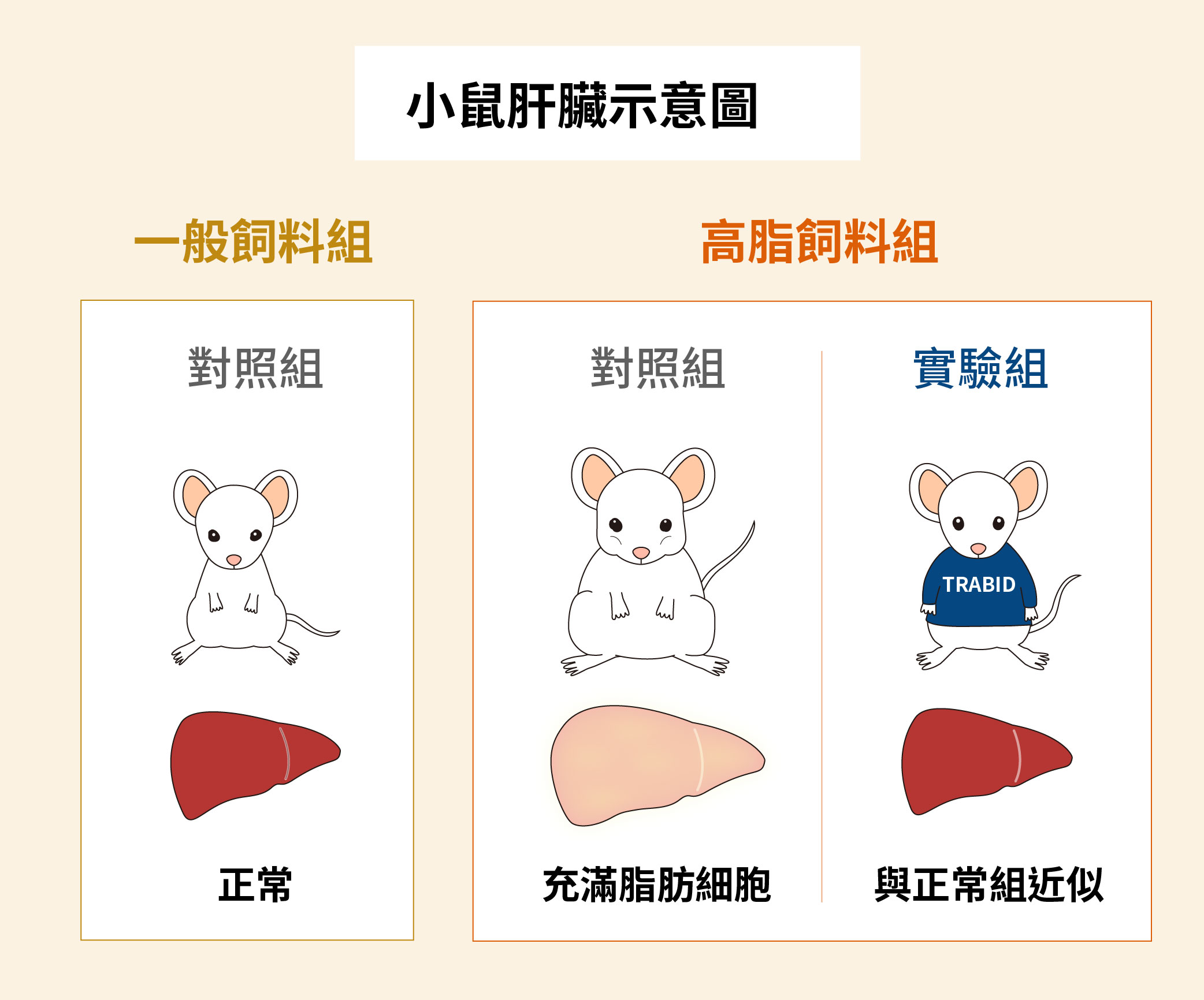 兩種不同處理之下,高脂餵食且注入一般腺病毒的對照組,肝臟細胞皆充滿脂肪,而且去泛素酶 TRABID 和激酶 VPS34 的表現量,以及細胞自噬的活性都明顯降低。而注射了 TRABID 基因的實驗組,因為人為促進了去泛素酶 TRABID 的表現,引發細胞自噬作用防止肝臟脂肪形成。