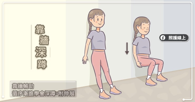 靠牆深蹲讓背部有個支撐,因此髖部或膝蓋較容易痛的人可以利用靠牆深蹲來鍛鍊腿部的力量。背對牆壁一小段距離站立,身體靠上牆壁,膝蓋彎曲讓身體順著牆壁往下滑,直到膝蓋打 90 度,大腿與地面平行。記得這時要讓小腿是垂直地面的。