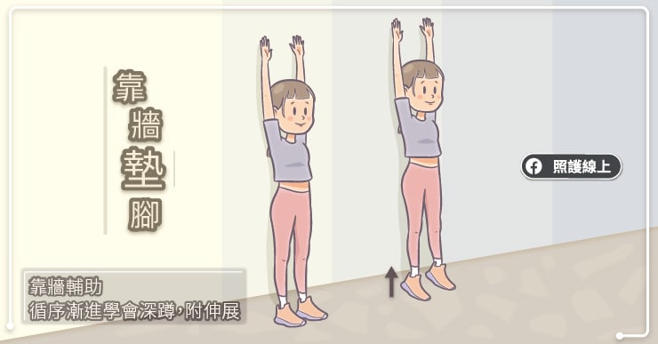 靠著牆壁站直,提起腳跟墊腳尖,鍛鍊腳踝與小腿的肌力。剛開始練習怕失去平衡會跌倒的時候,靠牆練習是個很好的開始。就算是你覺得自己沒辦法練到深蹲,靠牆墊腳這個動作平常還是可以多做。
