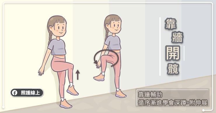靠牆站直,膝蓋往上提到讓大腿與地面平行時,膝蓋往外打開至側邊,再放下膝蓋收回原處,感覺髖部及大腿內外側的控制與穩定。
