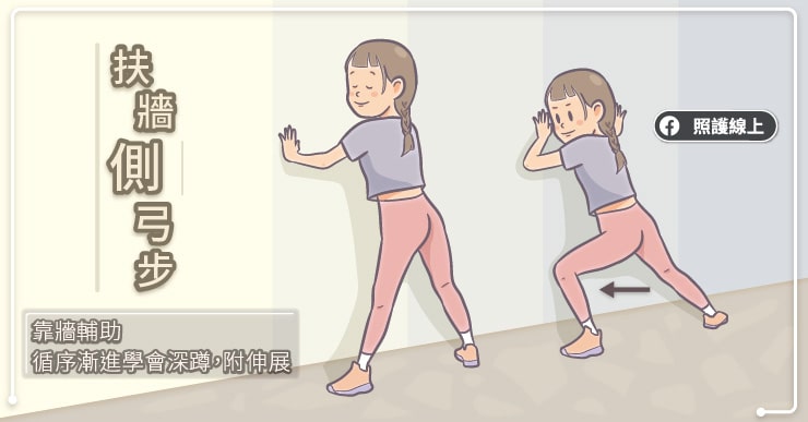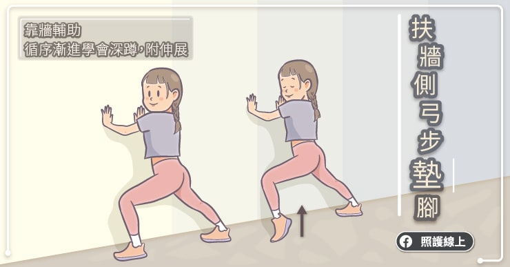 想要持續靠著扶牆練習加強髖部腿部肌力時,可以先回到練習側弓步的動作,試著在維持弓步的時候,抬起彎曲那一腳的腳跟,同樣可以訓練到腳踝、小腿、和大腿的肌力。