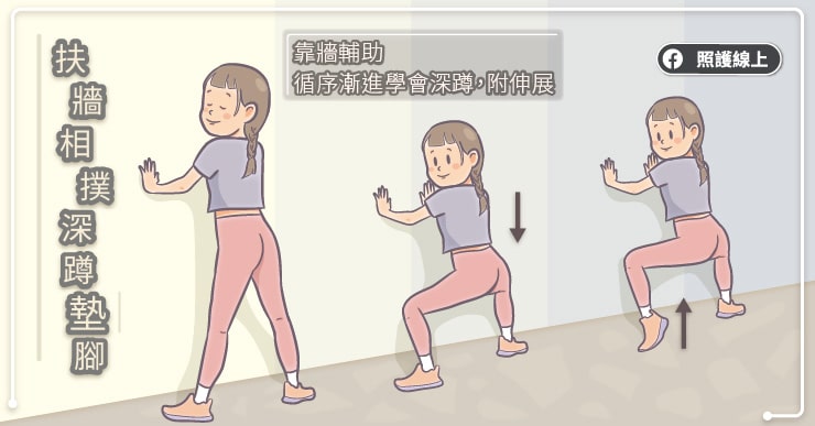繼續面對牆壁,手約在與肩同高度的位置扶著牆壁,雙腳打開約與肩同寬,或比肩膀略寬即可,腳尖往前或是微微往外側,先將髖部自然往後,再下沉身體,直到手臂伸直,完成深蹲動作,過程之中上半身維持直立不要彎腰。停留一下後再起身,反覆練習。