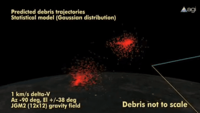 在大約12年前,有所謂的銥計畫,希望利用77顆人造衛星來達成在全世界任何角落都可以通訊的衛星電話,但是因為使用者不如預期,這計畫也很快地被放棄,但是那些沒有進行預期任務的繞地衛星仍繼續待在軌道上;2009年,一顆銥衛星跟俄羅斯的衛星相撞,這影片是展示科學家計算相撞後飛散的碎片是如何在地球上空運動。