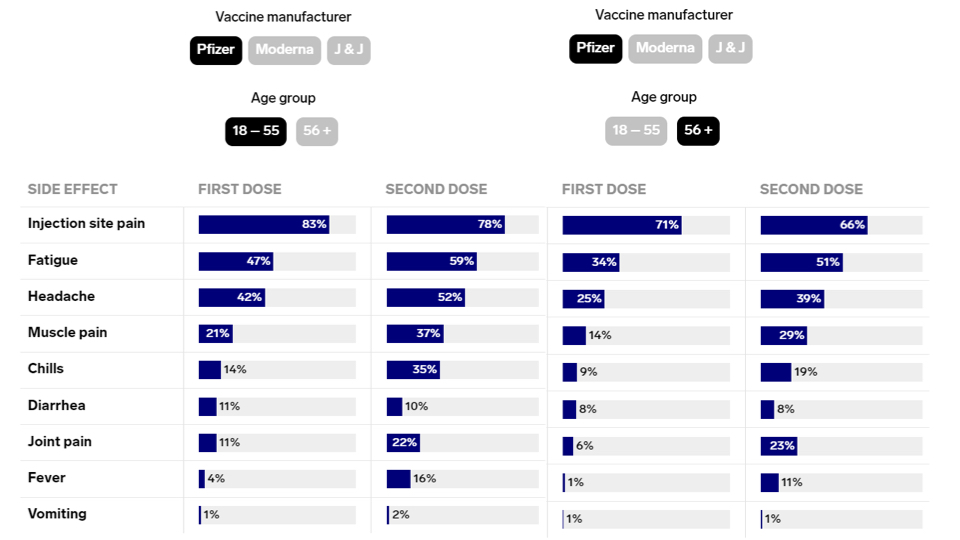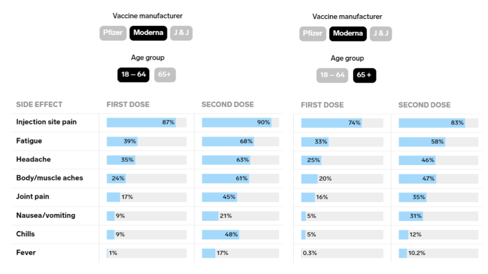 18 到 64 歲以下的族群,有將近 87% 的人,感到注射部位疼痛;相較於 65 歲以上的族群,則只有 74%。雖然在兩個年齡層中,第二劑所誘發的副作用,都比第一劑要來的強,但年長者施打 mRNA 疫苗的其他副作用,也幾乎都比年輕族群要來的小。