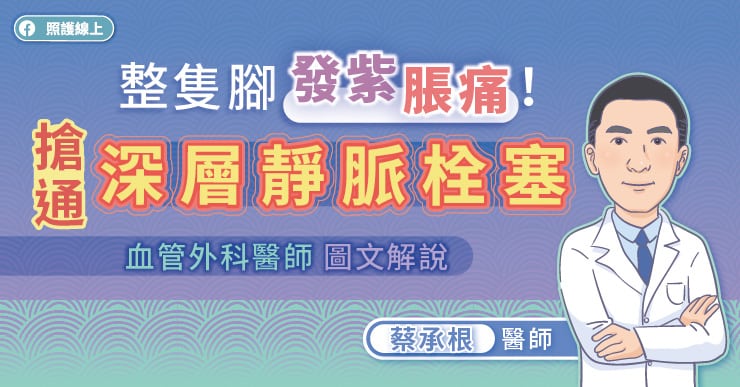 久坐、久站、臥床、長時間維持同樣的姿勢都會導致血液滯留而容易出現深層靜脈栓塞,大家要盡量避免。蔡承根醫師提醒,如果出現單腳腫脹、疼痛、發紅、發紫的狀況,務必盡快就醫,才能及早搶通血管,恢復血液循環,以避免出現嚴重的併發症!