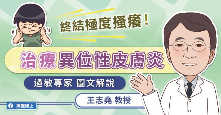 「異位性皮膚炎可能在嬰兒時期便出現症狀,例如頭部及臉部的肌膚發紅、乾燥、脫屑、嚴重搔癢等,且隨著情況越發嚴重,發炎情況還會往四肢伸側蔓延。」王志堯教授舉例,「像是年紀較大孩童的異位性皮膚炎常出現在頸部、耳垂、手肘、腕關節或膝關節等皮膚皺摺處。」