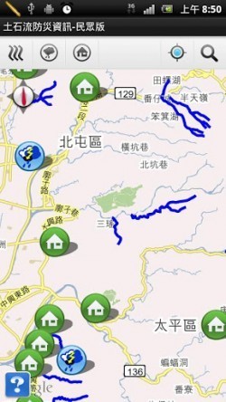 土石流防災資訊App的地圖版的螢幕擷取畫面,使用者能在地圖上看到身處位置周圍的土石流潛勢溪流、避難處所位置。(圖片來源:行政院農委會水土保持局)