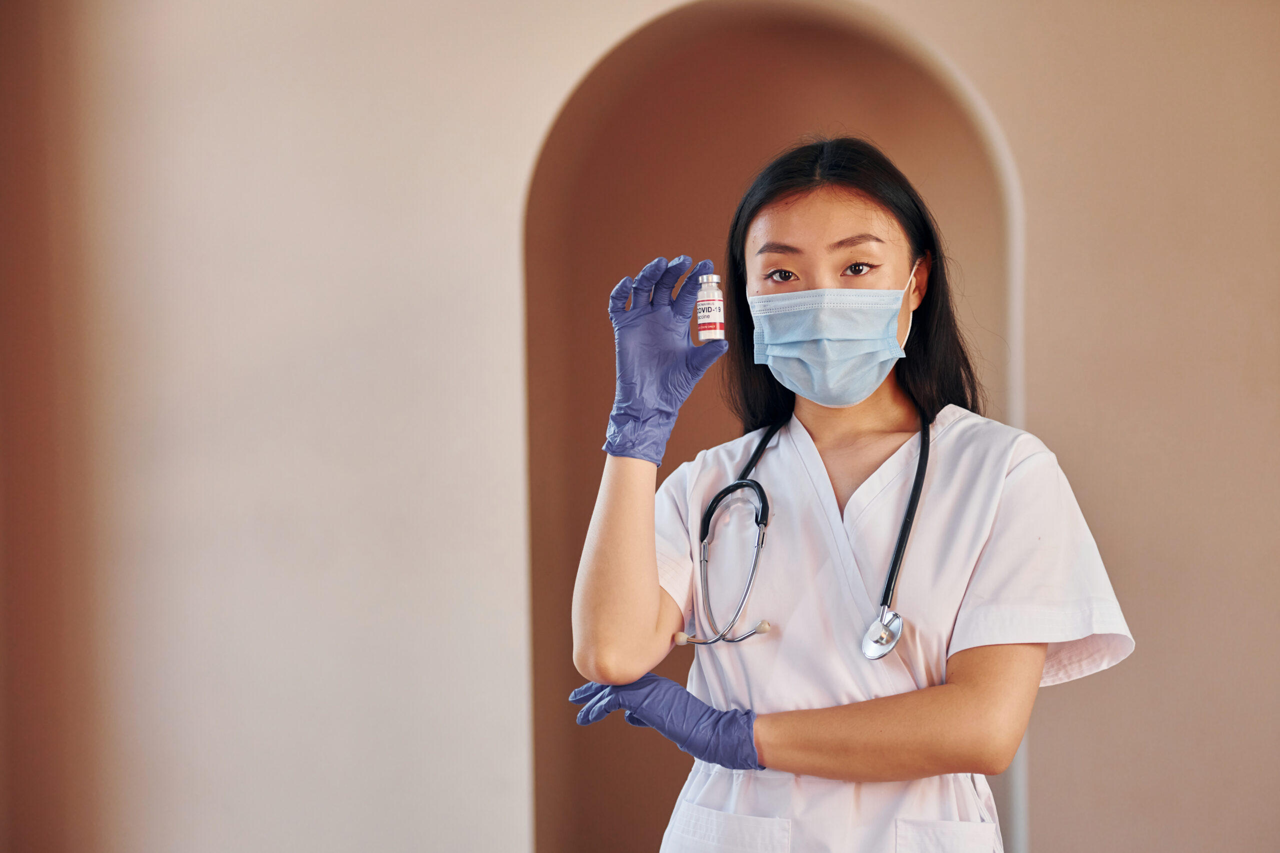COVID-19 vaccine. Young serious asian woman standing indoors.
