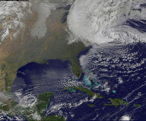 十月二十九日,珊迪颶風強烈侵襲美國東岸。(圖片來源:NASA)