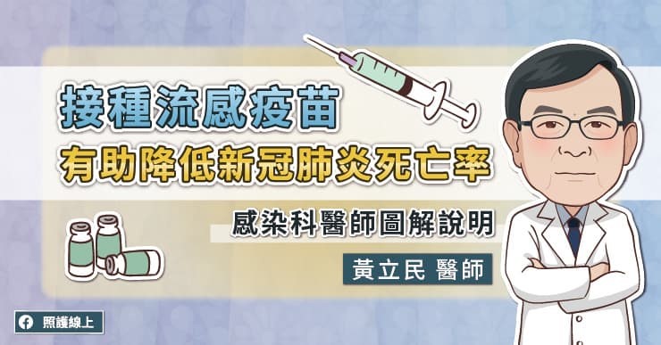 「研究指出,施打過流感疫苗,比較不會被診斷新冠肺炎 COVID-19;而且如果不幸得到新冠肺炎,死亡率也會降低。」黃立民醫師解釋,「因為很多新冠肺炎屬於輕症,如果患者單獨得到新冠肺炎,症狀可能不甚嚴重,而不會就醫。但如果同時得到新冠肺炎和流感,症狀比較嚴重使就醫機率高,也就較容易被診斷出來。」