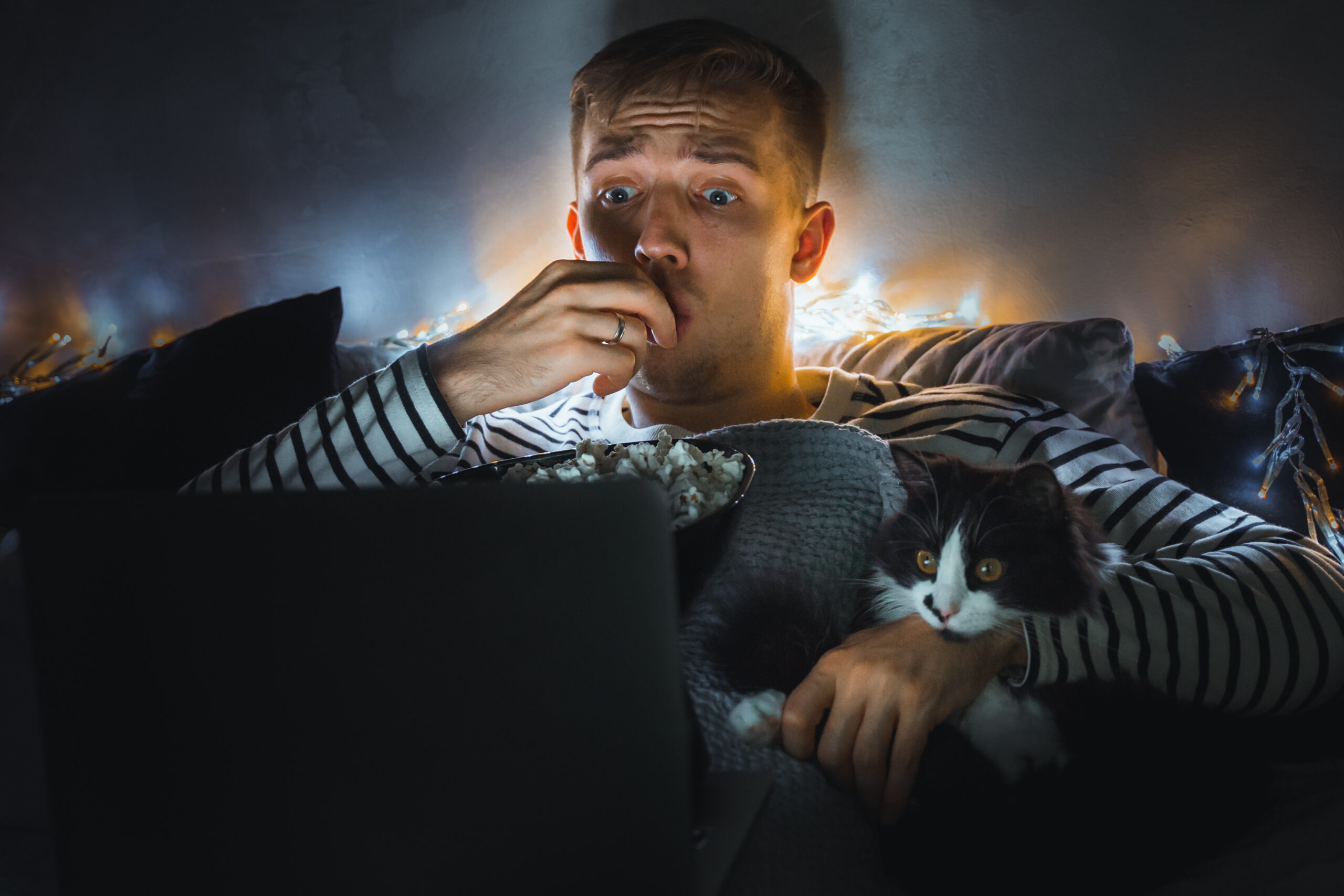 young man with black cat watching a movie eating popcorn on TV at home. Movie night. Relax,rest watching a horror film or video on screen. Background lighting. Fun Scared excited people on the couch.