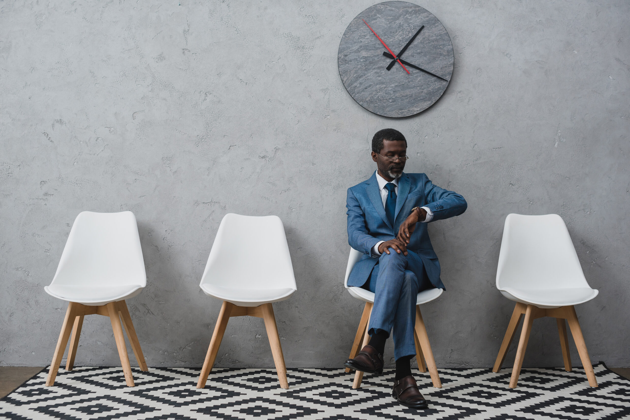 Handsome African american businessman sitting in a waiting room and looking at watch