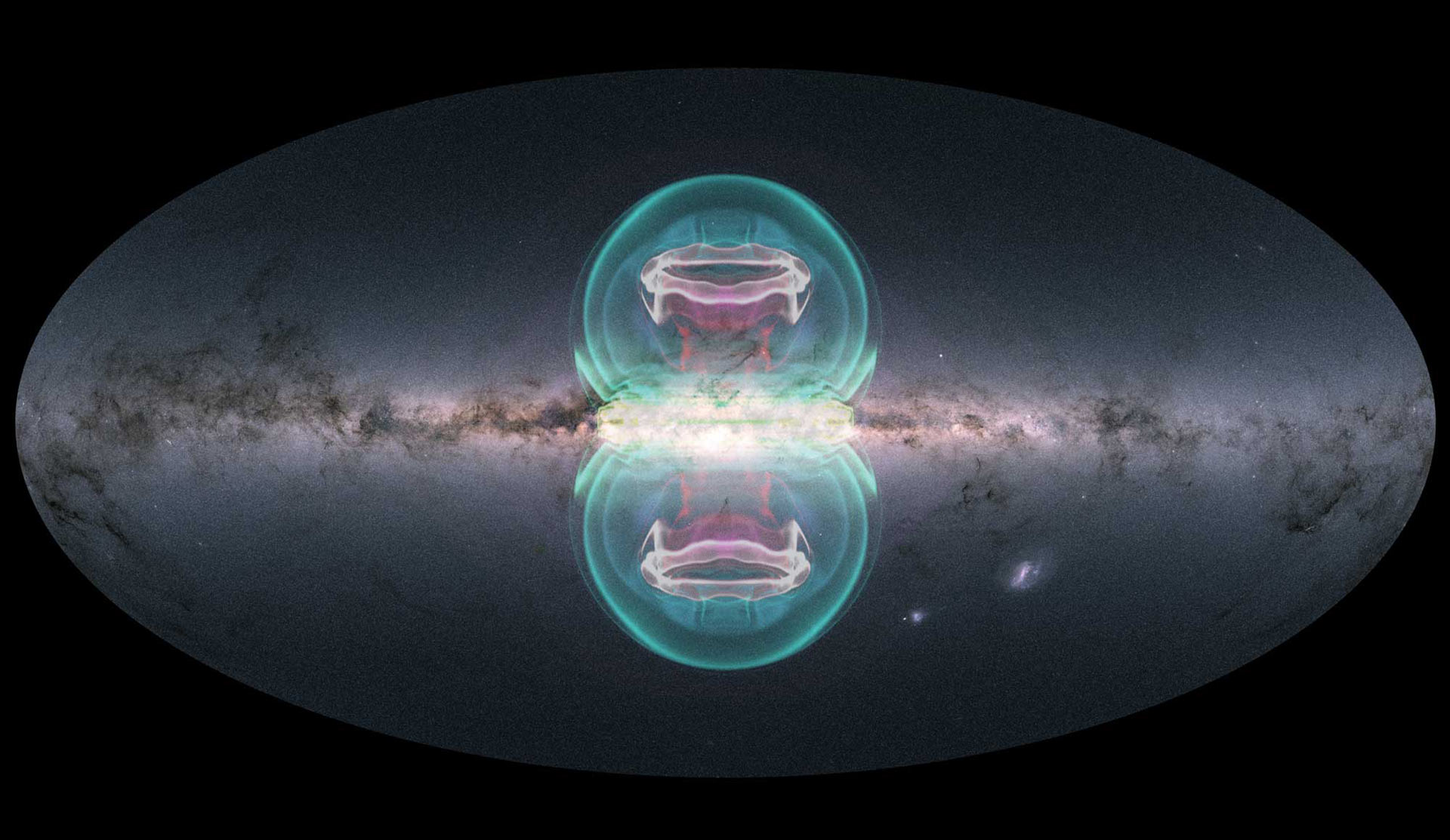 費米太空望遠鏡升空短短兩年後,天文學家就從觀測資料中發現,如果我們將費米的全天伽瑪射線圖中已知的星體(比如銀河系的瀰散氣體、中子星、其他星系等)全部扣除,將會看到銀河中心的上下兩側,各有一對高 50 度、寬 40 度的巨大橢圓形區域,而這是從未發現過的銀河系新結構!