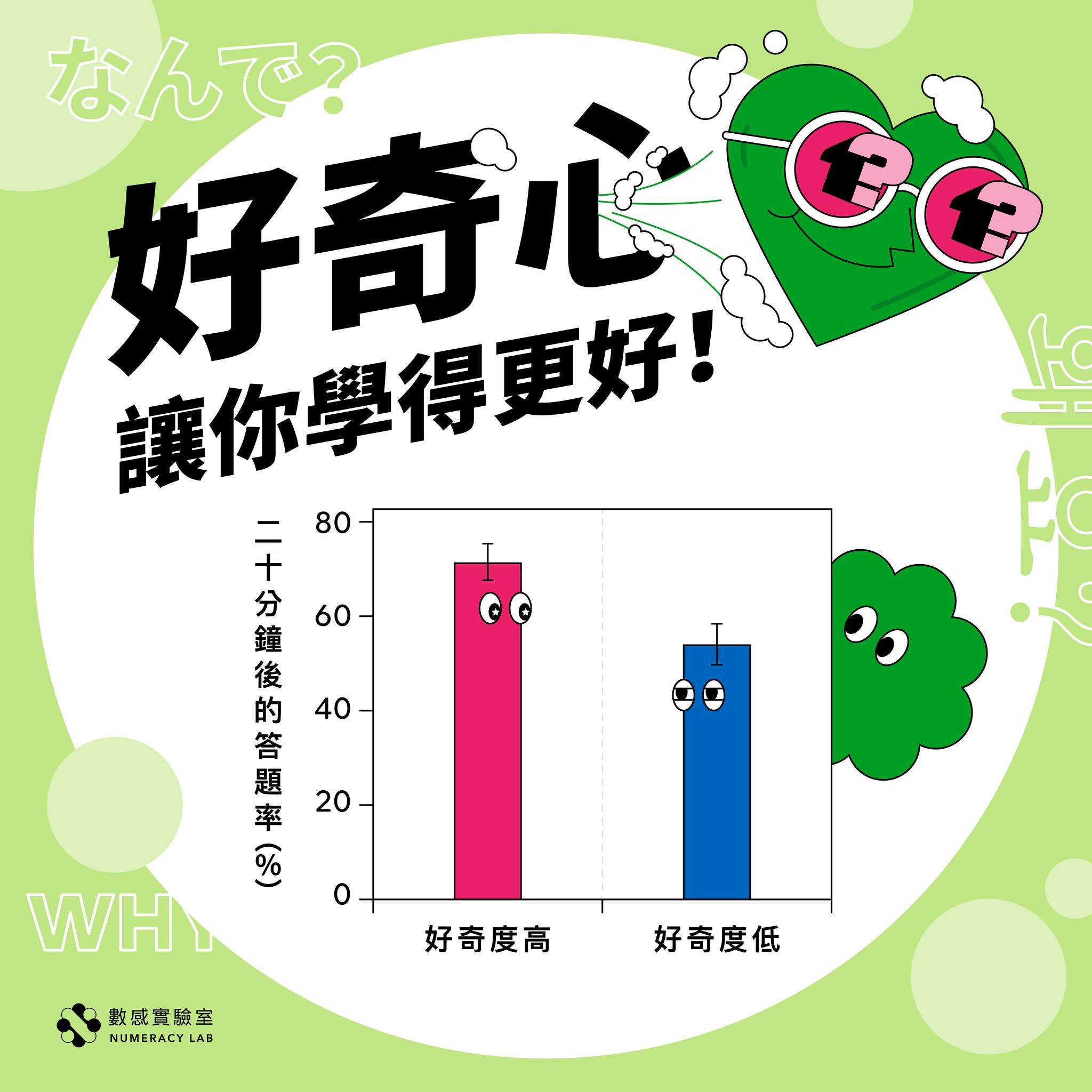 實驗結果發現,受試者20分鐘後,針對「好奇度高」的題目答對率高達 70.6%;「好奇度低」的題目答對率只有 54.1%。