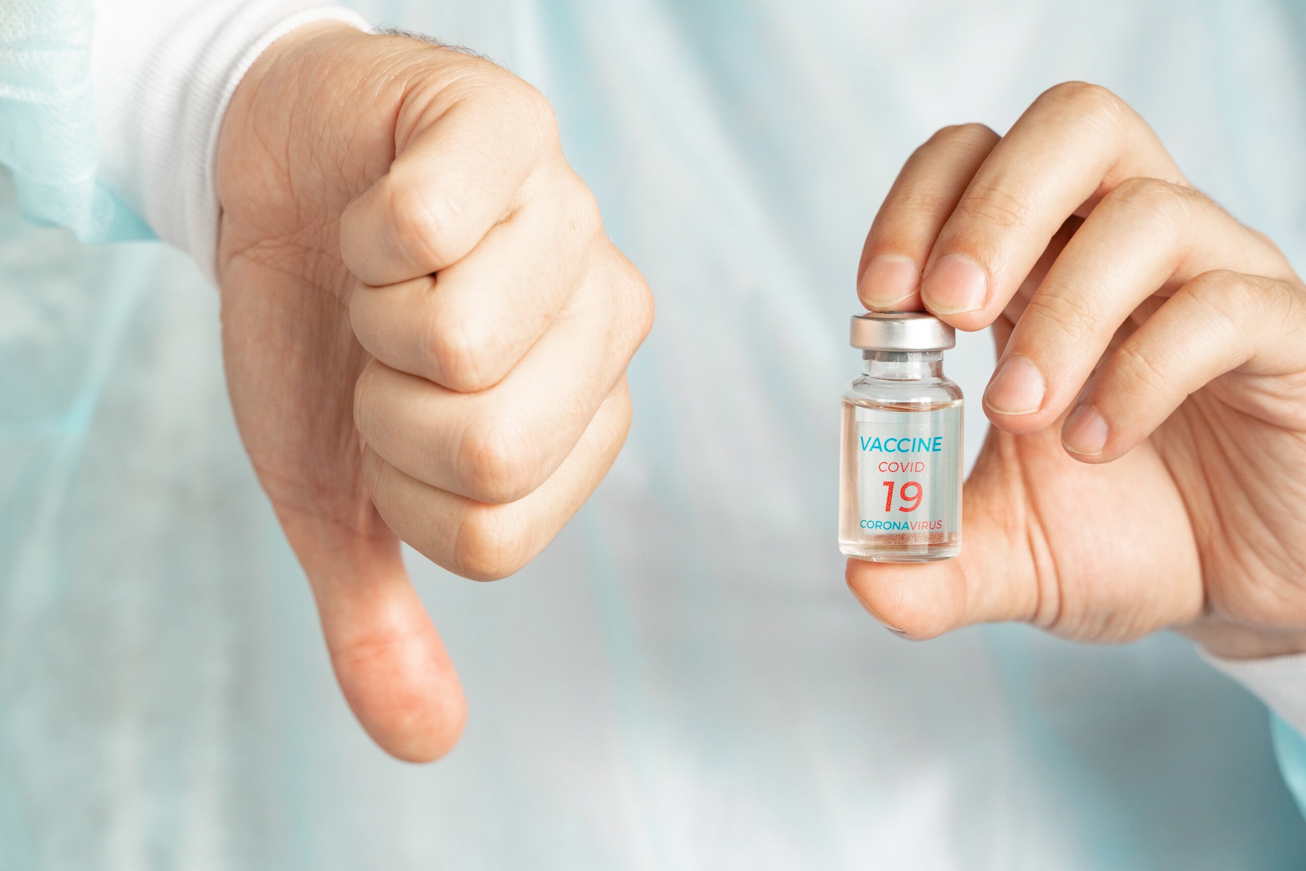 Vial with usa, american vaccine for covid-19 coronavirus,flu, infectious diseases. Anti vaccination, stop. Hand of doctor. Thumb down. Clinical trials of injection for administration for human,people.