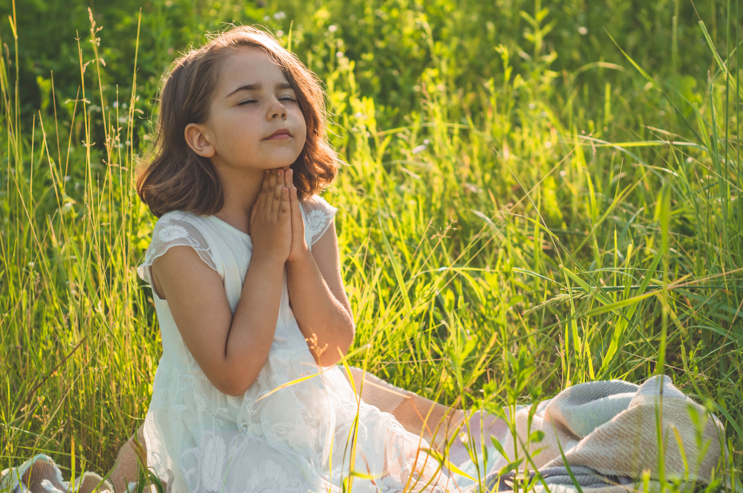 Little Girl closed her eyes, praying in a field during beautiful sunset. Hands folded in prayer concept for faith