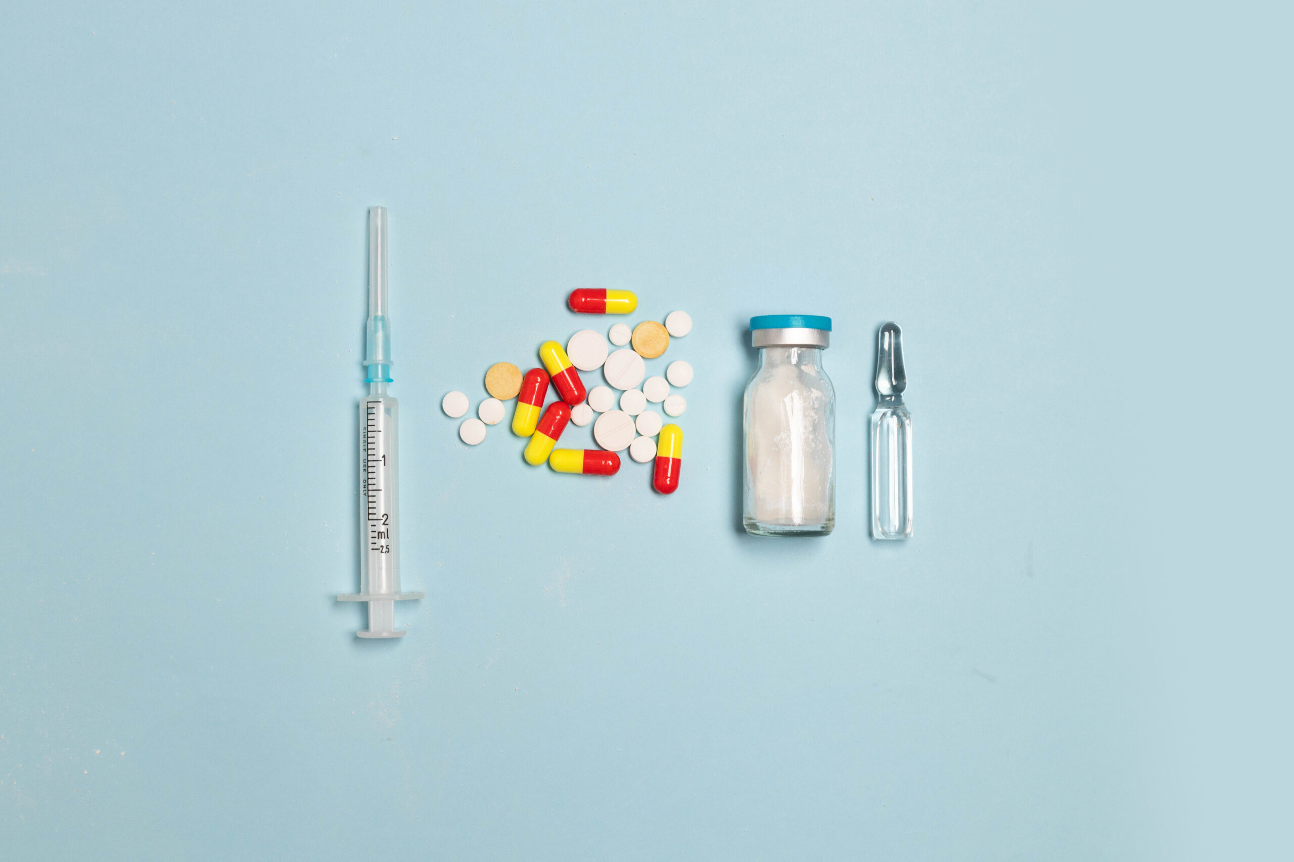Drugs heroin powder pills and syringes on blue background. Healthy lifestyle concept. International day against drug abuse
