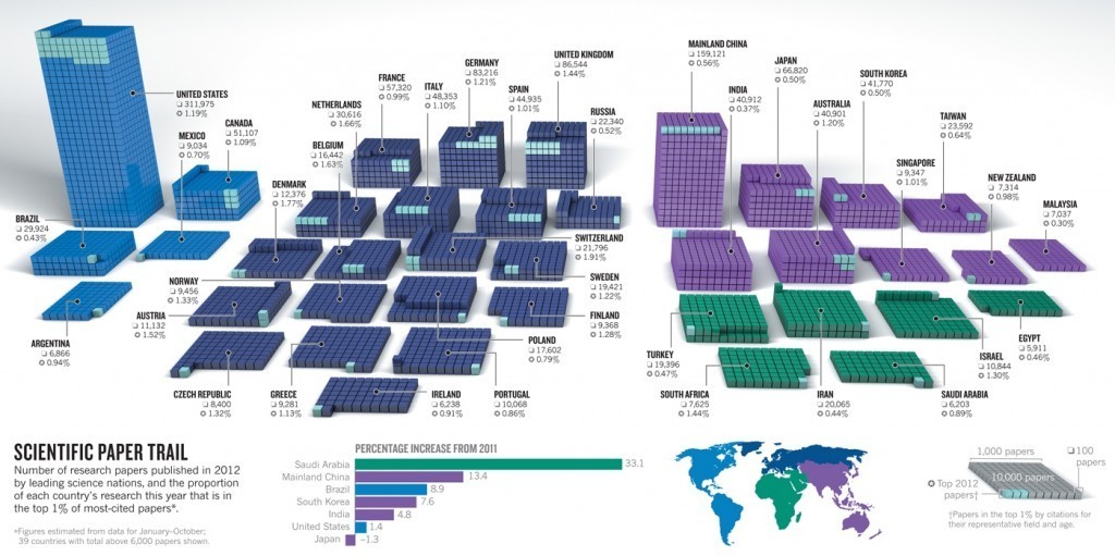 2012年是科學界史詩般的一年,研究者發現了希格斯玻色子,也有好奇號登上火星。在這飛躍的一年中,兩個最大的突破有賴於驚人的數據量。在過去五年來ENCODE計畫(Encyclopedia of DNA Elements)–由440位科學家組成–已產生15個太位元(Terabyte)的數據,以研究人類DNA序列的功能;而歐洲核子研究組織(CERN)已儲存了26個拍(10的15次方)位元由大型強子對撞機(LHC)所產生的數據,物理學家用它來尋找希格斯玻色子存在的證據。