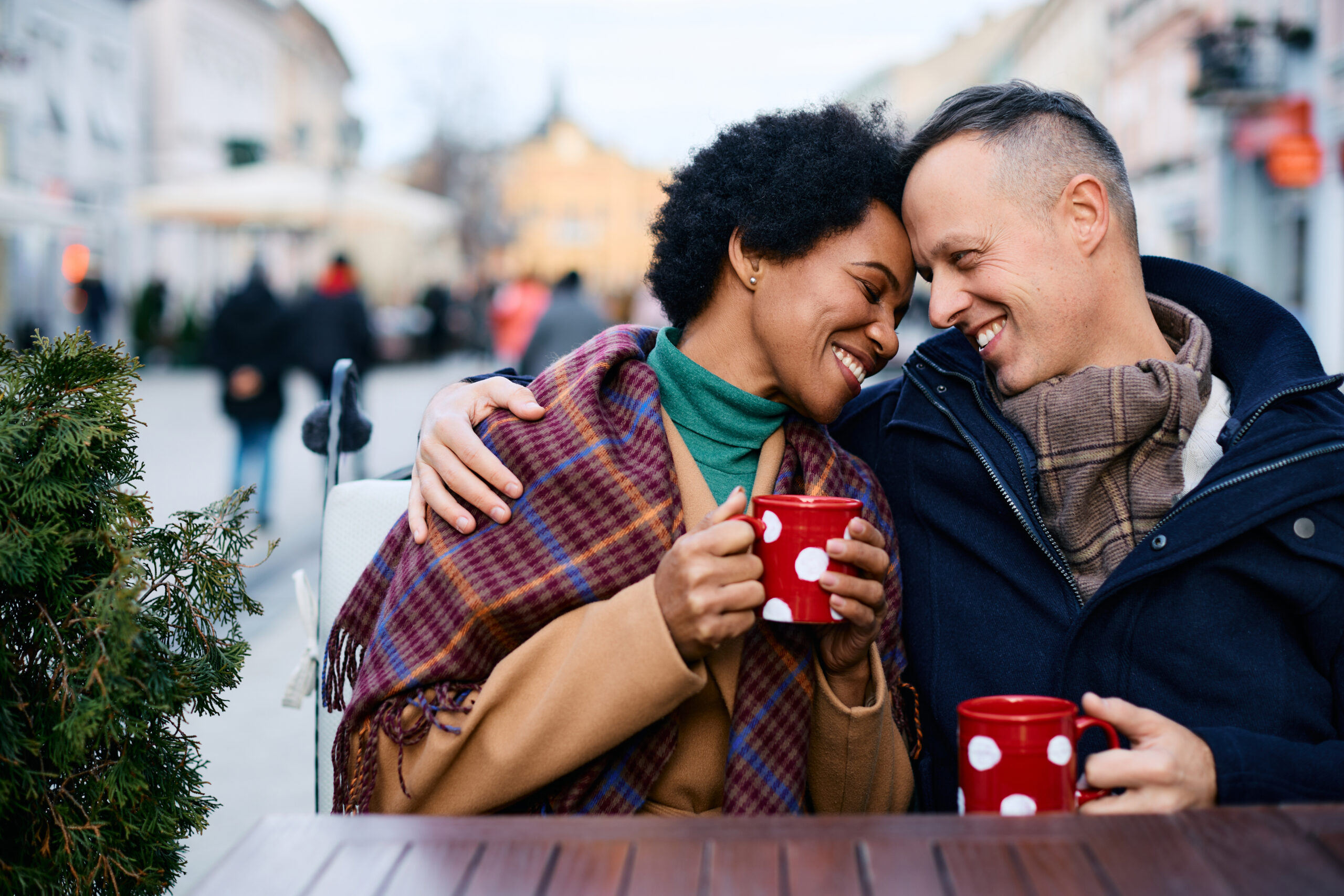 Happy couple in love enjoying in cup of mulled wine during winter day on Christmas market.