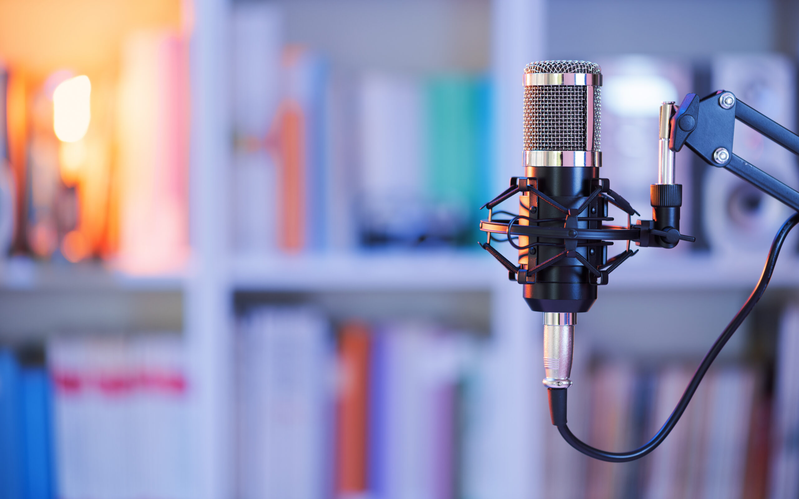 Radio microphone isolated on domestic background, concept of podcast, online radio, streaming, entertainment, audio, and new ways to do communication.