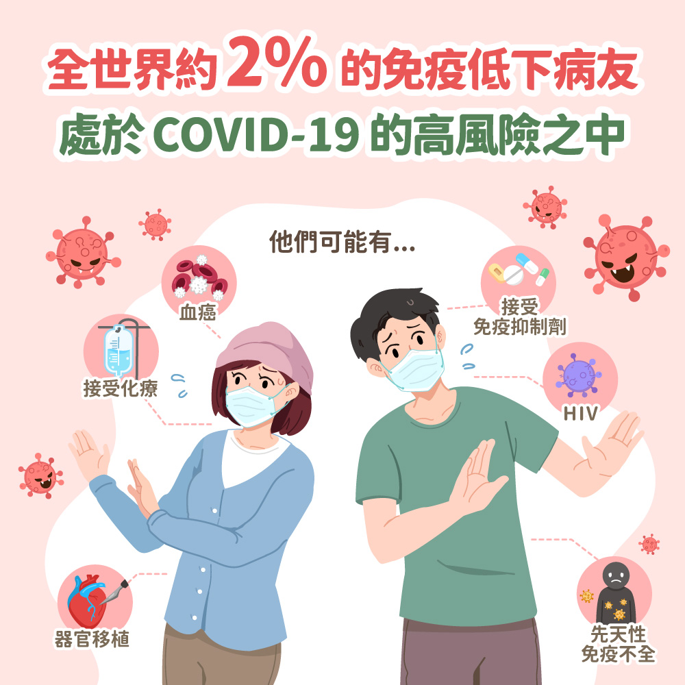 全球約有 2% 的免疫功能低下病友,包括血癌、接受化放療、器官移植、接受免疫抑制劑治療、HIV 及先天性免疫不全的患者…等,由於自身免疫問題,即便施打新冠疫苗,所產生的抗體和保護力仍比一般人低。即使施打疫苗,這群病人一旦確診,因免疫力低難清除病毒,重症與死亡風險較高,加護病房 (ICU) 使用率是 1.5 倍,死亡率則是 2 倍。