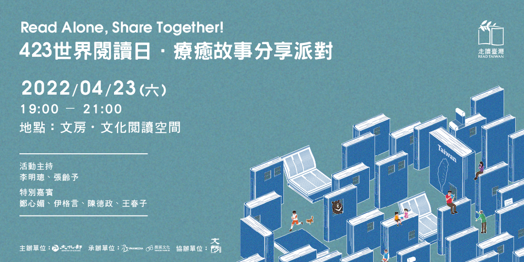 活動說明:一、線上報名成功的參與民眾,請自選攜帶一本「故事書」(任何類型、只要內容有故事述說皆可,包括小說、散文、詩、繪本、漫畫、劇本等),甚至也可以是自己的故事創作,來到派對現場。希望大家分享故事的主題設定,為「療癒」(可以是生、心理或各種意義各種方式的療癒)。二、有意願上台分享朗讀者,請於先至活動會場後台登記排序(共計15位,額滿截止),工作人員也會將其帶來的書封掃描圖檔。主持人將依序介紹志願分享者上場,大螢幕也會同步投影他所分享書的封面。三、每位分享朗讀者,可利用三分鐘,閱讀書中一段、或摘要簡述故事(或部分內容)。在兩位主持人的簡單訪談、與串場過程中,也將邀請特別嘉賓穿插上台,分享朗讀的形式與志願上台的民眾相同(不限朗讀自己或他人之作品)。