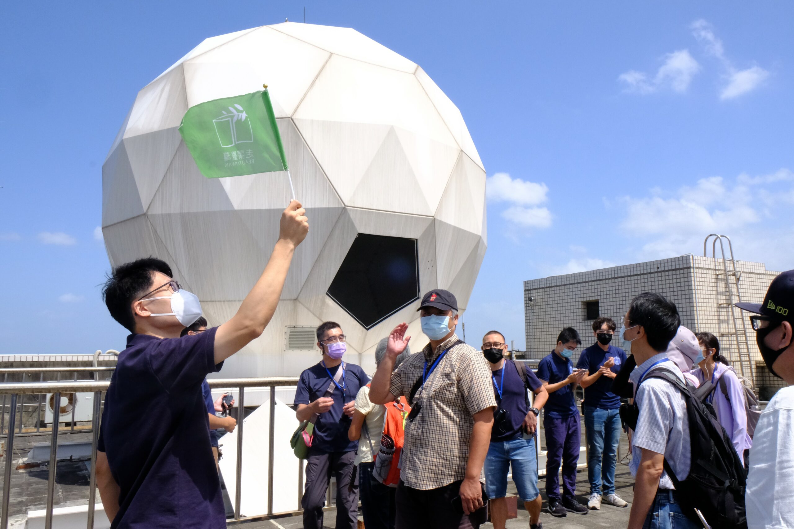隨後,全體移動到中心院館健雄館的頂樓,參觀地面站的碟型天線。碟型天線不只能夠接收衛星訊號,還可以向衛星發射指令,以執行包含科學研究、圖資、通訊、國土安全、災害防治、救災等任務。