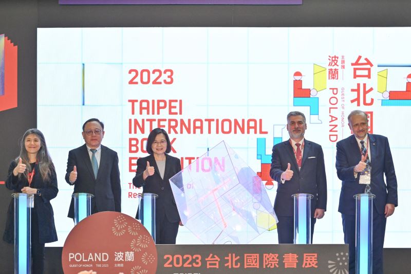 2023台北國際書展今(31)日開幕,總統蔡英文(左3)、文化部長史哲(左2)、台北書展基金會董事長吳韻儀(左1)、波蘭辦事處長高則叡(Cyryl Kozaczewski,右2)、波蘭書協會長達魯斯・雅渥斯基(Dariusz Jaworski,右1)共同為書展主持開幕儀式。