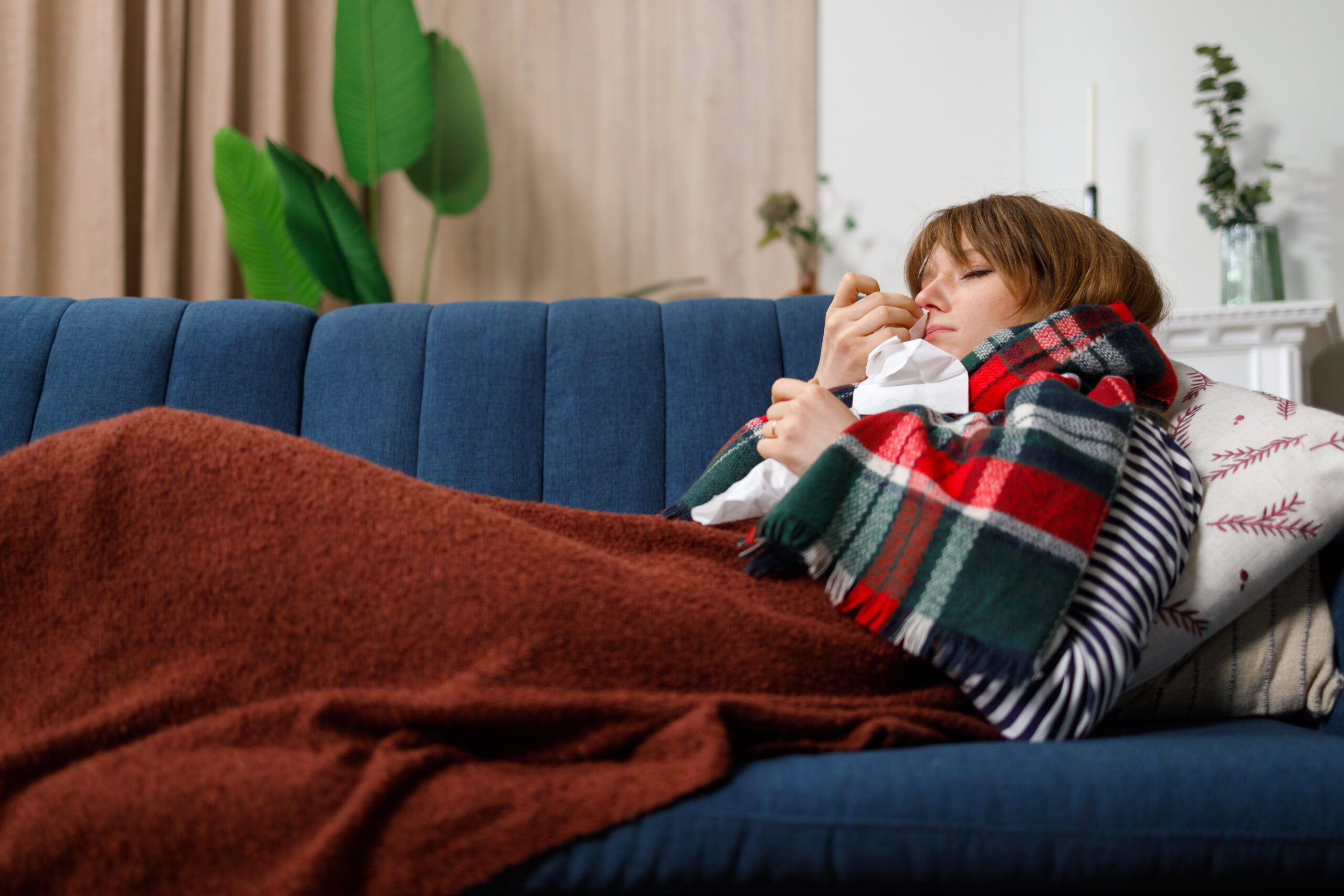 Young unhappy woman lying on the couch with a cold. Girl is sick on seasonal respiratory diseases