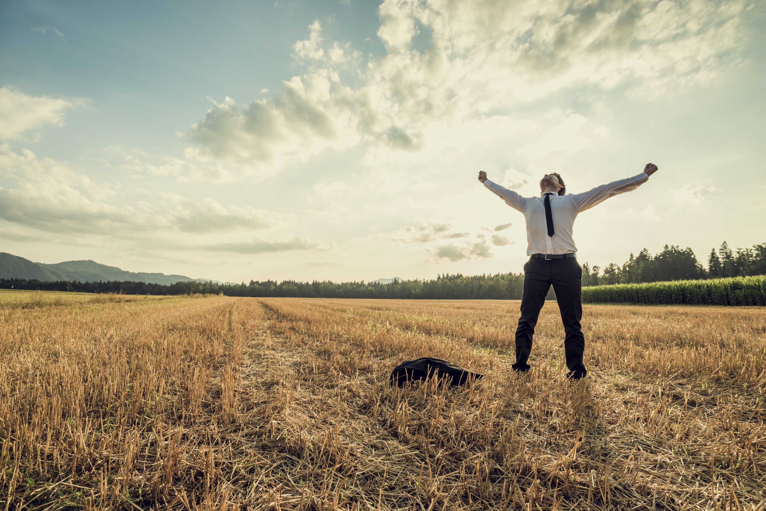 Successful businessman standing victoriously in the middle of field raising his arms in celebration and relief as he stands under majestic evening sky with his jacket lying on the floor next to him.