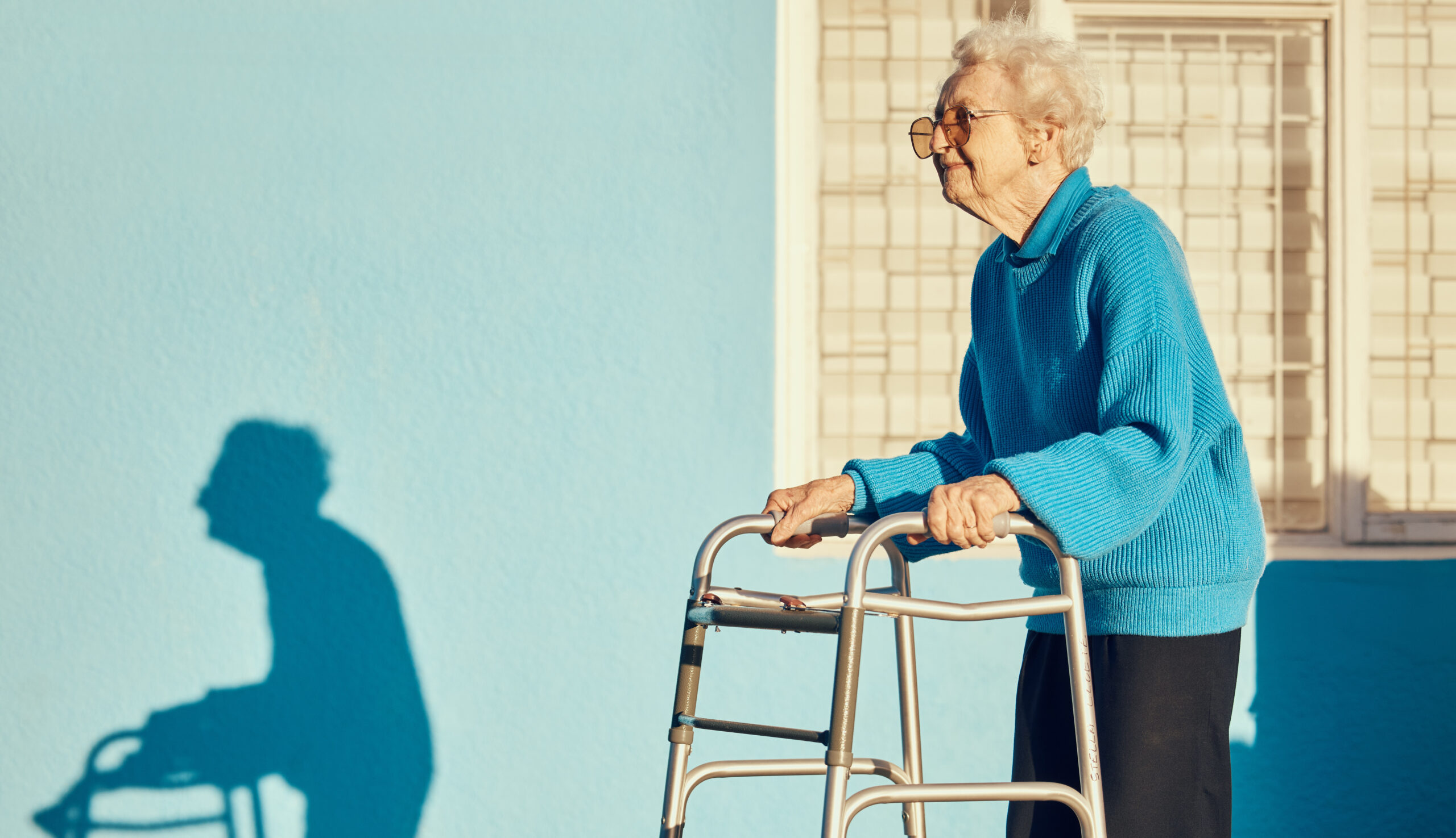 Senior, walker and woman in a city with a disability, osteoporosis or arthritis walking with mockup.