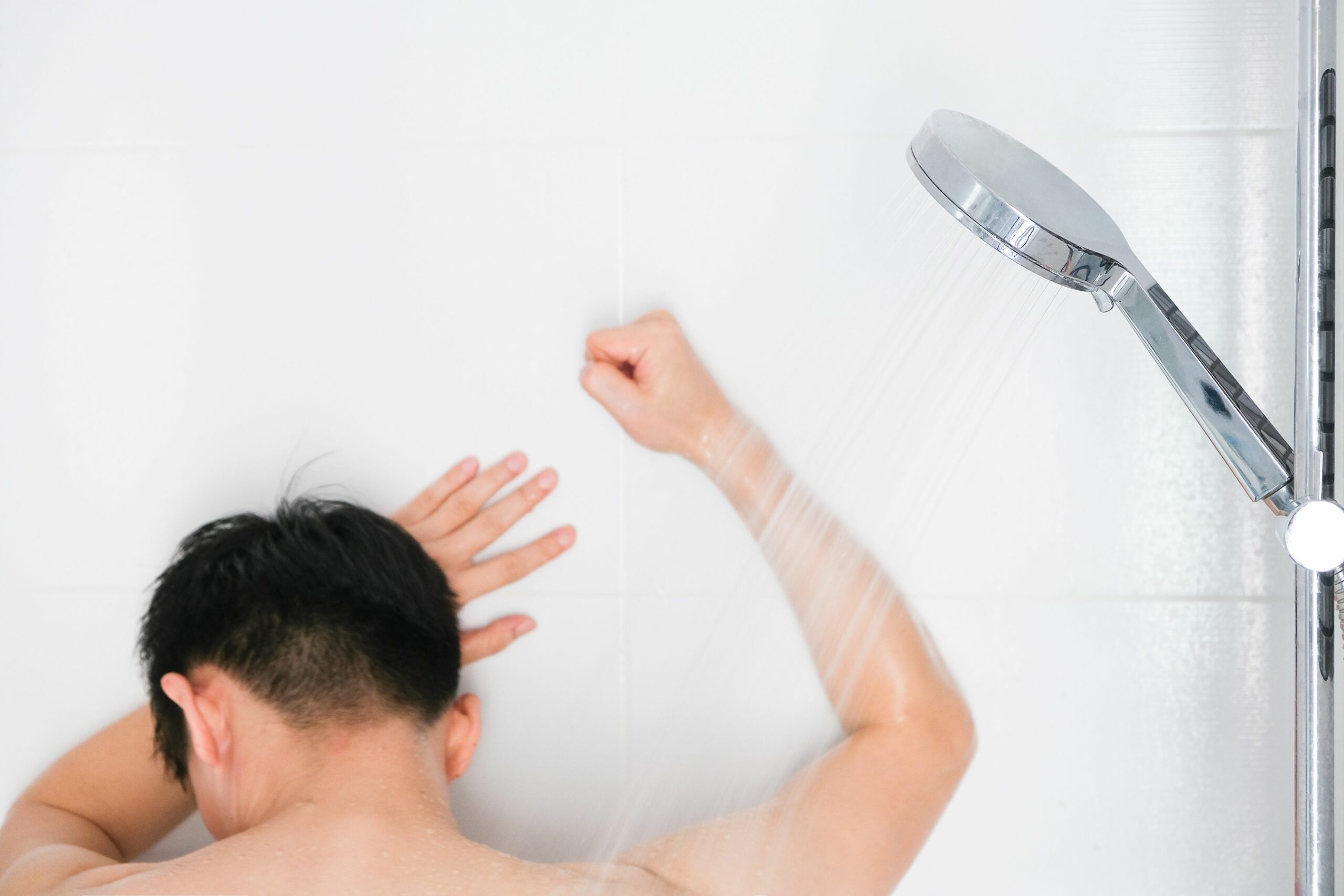 A young Asian man feels uncomfortable and experiences the stress of working all day. And he took a shower in the bathroom and showed an uncomfortable expression that was angry.