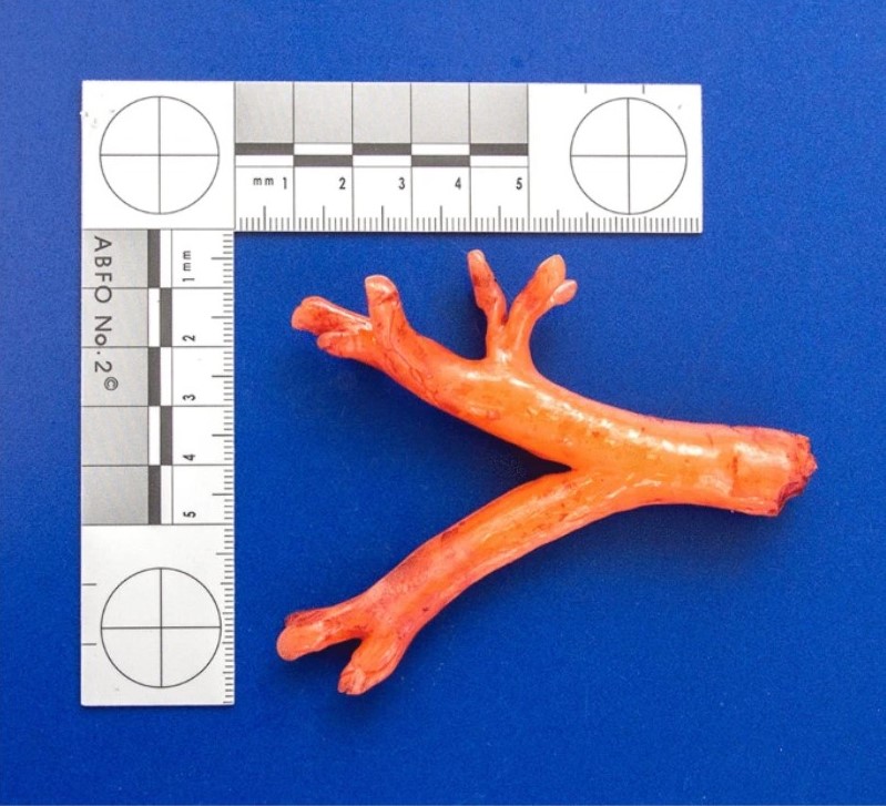 隔天,法醫仔細檢驗這具 140 公分高,28 公斤重的屍體,與死亡相關的發現,包括:取出的矽膠,跟氣管下半部、主支氣管和肺節支氣管完全吻合(照片);肺水腫(pulmonary oedema);急性肺氣腫(acute emphysema);以及肋膜下的瘀點(petechiae)等。另外,假體製作師拿的混合槍,容量為 50 毫升;而從男孩體內取出的矽膠(圖 4),約有 43 毫升。至於出事時用的那支氣切管,充氣氣囊與測風球的功能都正常。[1]