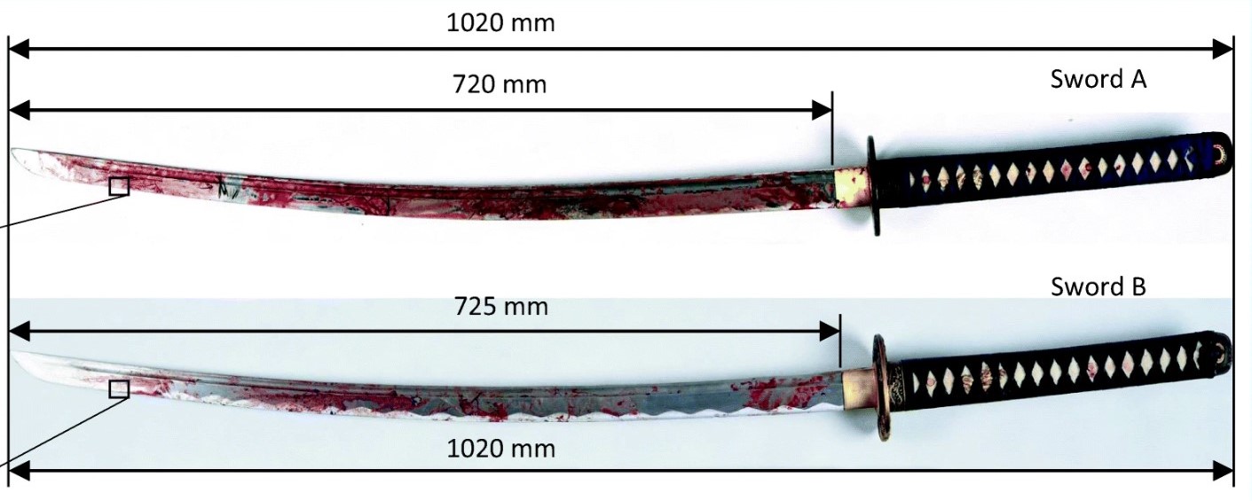 兩把武士刀的外型,無疑非常相似。不過,製作刀器時的打磨等動作,以及使用造成的磨損,如果留下足夠的紋路,就可能在死者身上產生不同的痕跡。換句話說,驗屍的時候,要挑選刀痕明確,且含有相當細節的砍傷,來進行比對。[1]