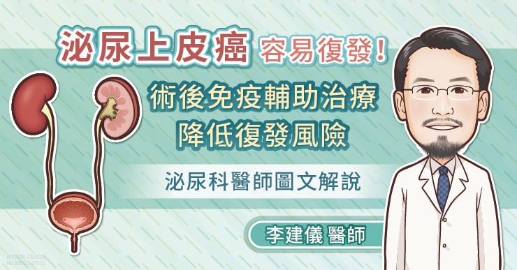 在狀況許可時,會使用手術治療切除腫瘤,不過泌尿上皮癌術後復發風險較高。李建儀醫師說,泌尿上皮癌患者中近 8 成在 5 年內有復發的危險,建議進行術後輔助治療以降低復發風險,可使用化學治療或免疫治療。