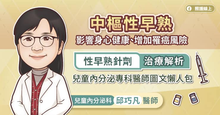 邱巧凡醫師說,性早熟不只會影響身高,還會影響心理健康,且增加成年後罹患代謝症候群、糖尿病、高血脂、高血壓等問題,甚至提高乳癌、子宮內膜癌、卵巢癌等風險。在孩子的生長過程中,照顧者要持續留意生長狀況,長得太高、太矮、太快、太慢,或是不對的年齡出現第二性徵都要提高警覺。如果有任何疑問,請及早至「兒童內分泌科」就診諮詢與評估。