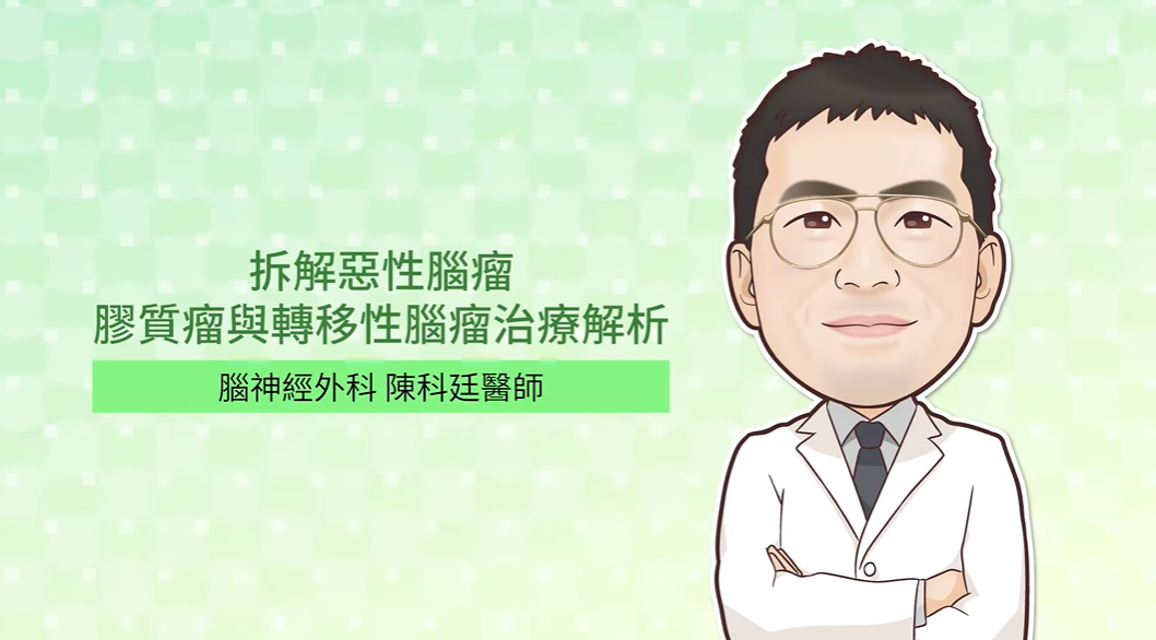 陳科廷醫師:原則上就分兩大類,一個叫做原發性的惡性腦瘤,一個叫做續發性的惡性腦瘤,原發性的惡性腦瘤,最常見的就是膠質瘤,就是神經膠細胞長出來的,續發性的惡性腦瘤,就是俗稱的轉移性腦瘤,最常見的是肺癌跟乳癌的腦轉移。