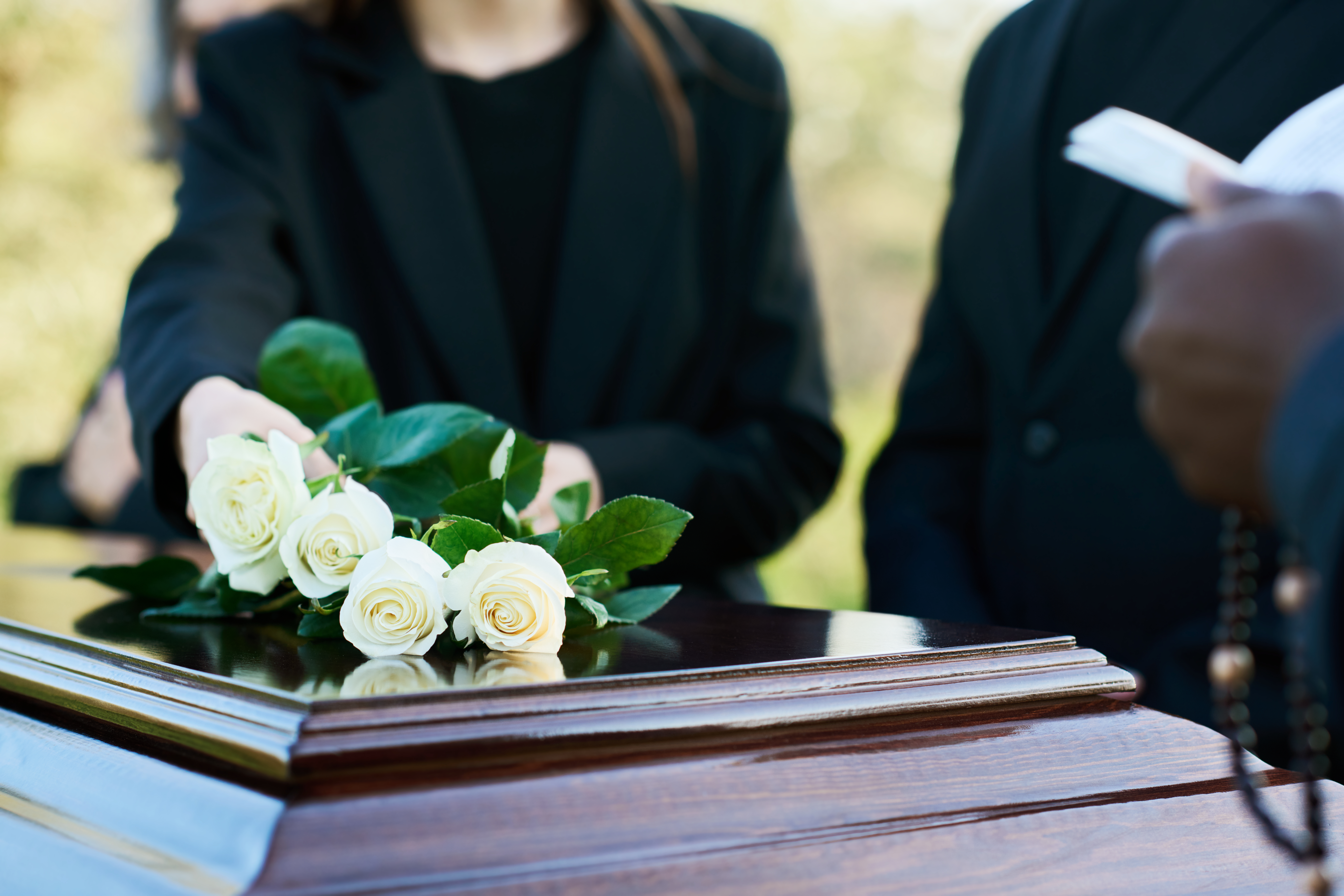 Young woman in black suit putting four fresh white roses on closed lid of coffin while standing by her father and priest reading Bible