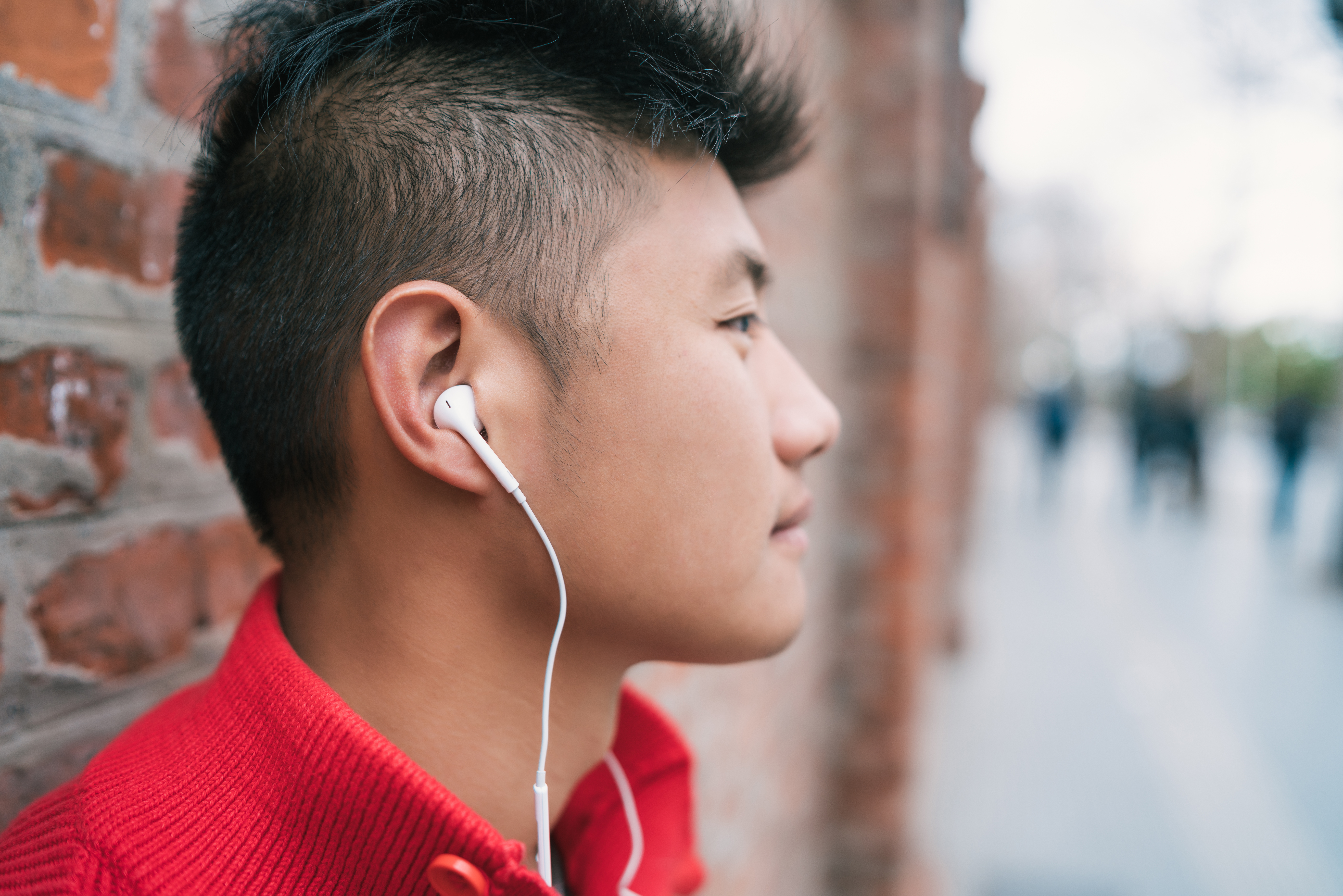 Portrait of young Asian boy listening to music with earphones outdoors in the streetl. Urban concept.